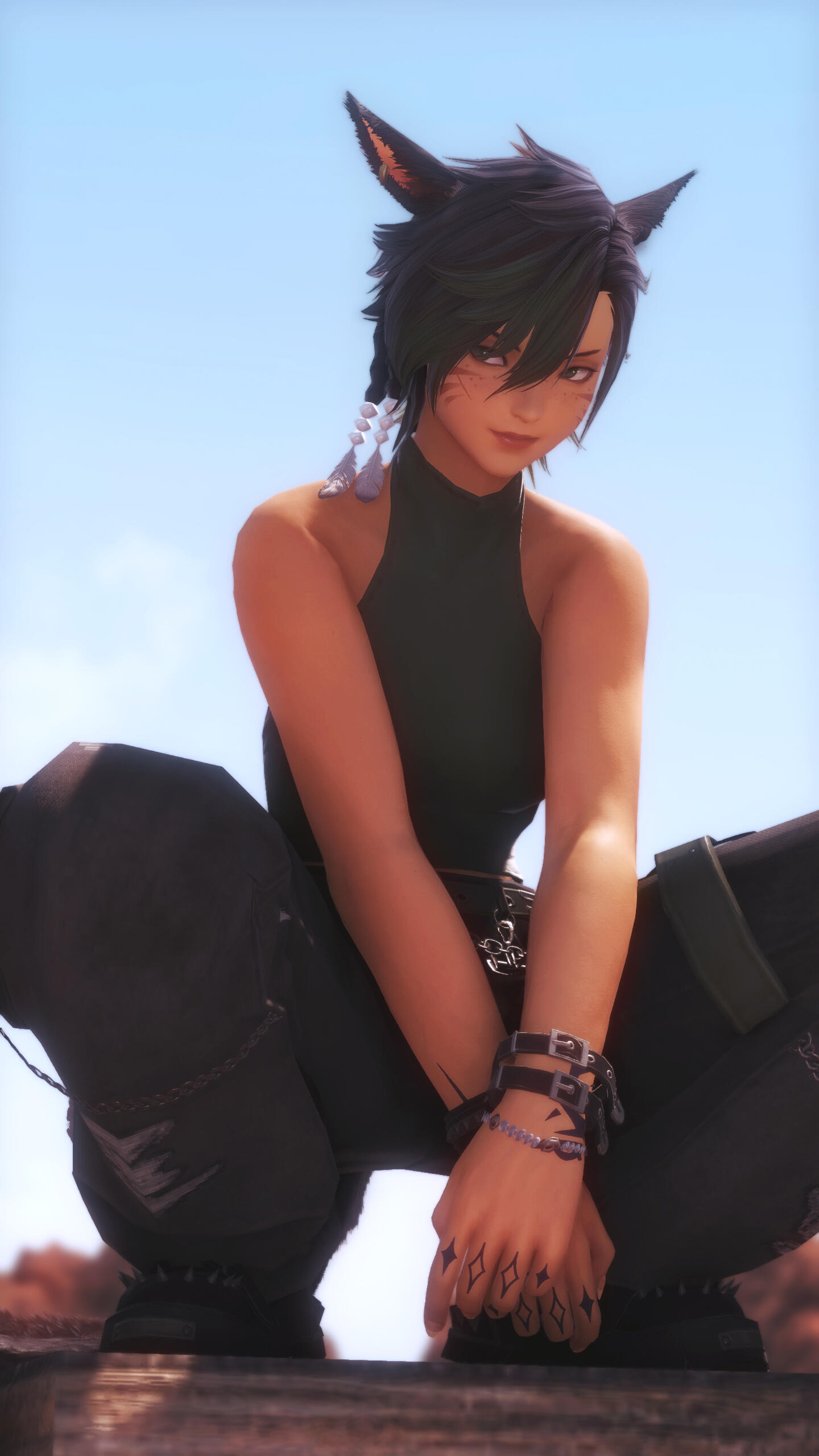 BACKGROUND. Born and raised in the Golmore Jungle, a forbidden love grew between the daughters of the tribe's elders. They shared secrets and dreams under the starlit sky for half a decade, yearning for a life where they could live without fear of judgement. After months of planning, the teens plotted their escape in the middle of the night, stealing away on a ship bound for Kugane.Once accustomed to the outside world, the bond between the two fizzled out and they went their separate ways. Knowing she couldn't return to her homeland, Taranis worked as a server at the Umineko teahouse for a few years to pass the time and deepen her pockets.The young Rava woman grew restless - constantly finding herself eavesdropping on the international traders and tourists as she served them their meals. Taranis's sense of wanderlust was insatiable, spending each night staring at the very stars that'd guided her away from her village all those years ago.Now a grown woman, the Viera still dreamt of exploration and enlightenment. She decided it was time to take charge of her future once more, enrolling in classes at the Doman Enclave that would teach her the art of healing.Much to her tutor's surprise, the arcane magicks came naturally to Taranis. Astrology was her calling, and she dove in headfirst. With nothing more than a torquetum, her tarot cards, and an eager heart, the Viera woman set her eyes to the horizon, ready to follow wherever the stars might lead.